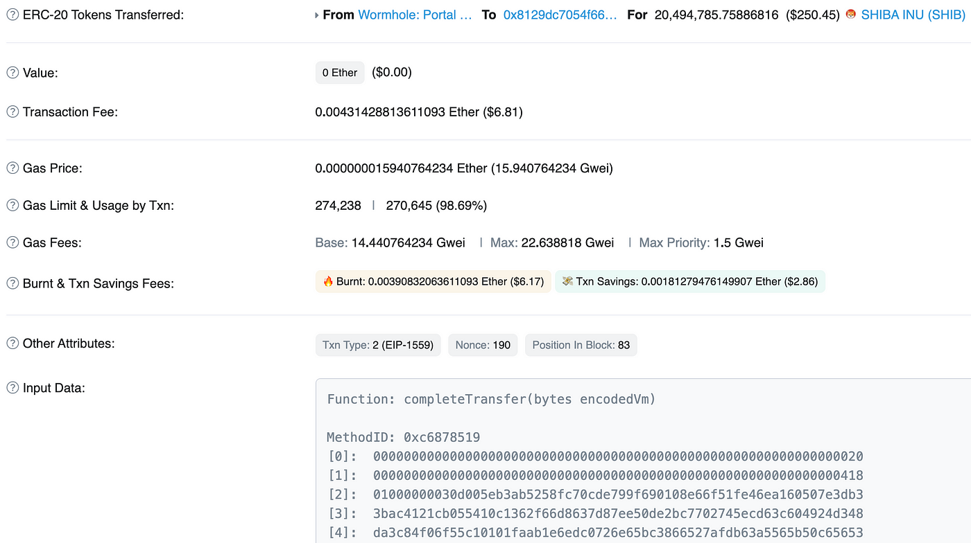 Note that on Ethereum, global storage operations (SSTORE) incur the largest gas cost. This explains why redeeming a token is expensive. For example, in the following transaction, calling completeTransfer costs $6.81 (270K gas):